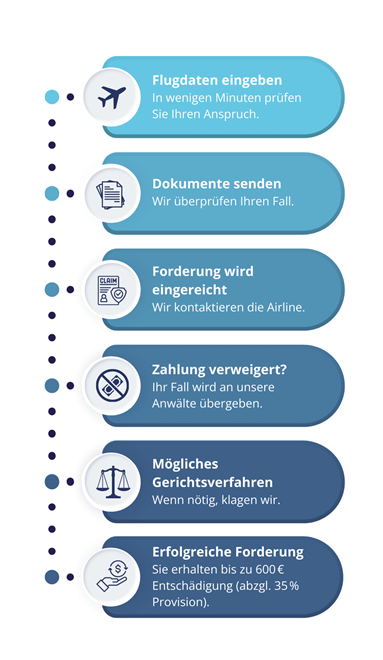 Sobald die Airline Ihrem Anspruch zustimmt, erhalten Sie Ihre Entschädigung direkt auf Ihr Konto. Je nach Flugdistanz beträgt diese bis zu 600 € pro Person (abzgl. 35 % Erfolgsprovision). Sie können sich entspannt zurücklehnen, wir erledigen den Rest.